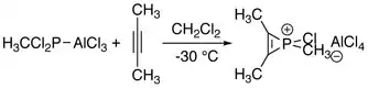 The first series of phosphirenium ions were synthesized by reacting alkynes with methyl- or phenylphosphonous dichloride and aluminum trichloride. These reactions may be regarded as formal addition of "RClP+" to alkynes.[1]
