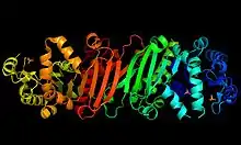 ![]() 3D cartoon depiction of a phosphoribulokinase protomer from Methanospirillum hungatei | |||||||||