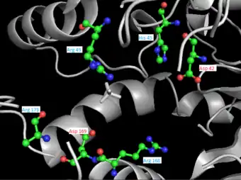 In Rhodobacter sphaeroides, PRK (or RsPRK) exists as a homooctomer with protomers composed of seven-stranded mixed β-sheets, seven α-helices, and an auxiliary pair of anti-parallel β-strands.[10] The RsPRK subunit exhibits a protein folding analogous to the folding of nucleotide monophosphate (NMP) kinases.[3] Mutagenesis studies suggest that either Asp 42 or Asp 169 acts as the catalytic base that deprotonates the O1 hydroxyl oxygen on RuP for nucleophilic attack of ATP, while the other acts a ligand for a metal cation like Mg2+ (read mechanism below for more details).[10] Other residues present at the active site for RsPRK include His 45, Arg 49, Arg 168, and Arg 173, which are purportedly involved in RuP binding.[10] (See image at right).