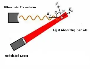 Specifically, when an intensity modulated light wave is exerted on a localized medium, the resulting heat can induce an alternating and localized pressure change. This periodic pressure change generates an acoustic wave with a specific frequency. Among various factors that determine this frequency, the velocity of the heated area and thus the moving particles in this area can induce a frequency shift proportional to the relative motion. Thus, from the perspective of an observer, the observed frequency shift can be used to derive the velocity of illuminated moving particles.[1]