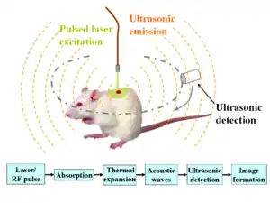 Photoacoustic microscopy is an imaging method based on the photoacoustic effect and is a subset of photoacoustic tomography. Photoacoustic microscopy takes advantage of the local temperature rise that occurs as a result of light absorption in tissue. Using a nanosecond pulsed laser beam, tissues undergo thermoelastic expansion, resulting in the release of a wide-band acoustic wave that can be detected using a high-frequency ultrasound transducer.[1] Since ultrasonic scattering in tissue is weaker than optical scattering, photoacoustic microscopy is capable of achieving high-resolution images at greater depths than conventional microscopy methods. Furthermore, photoacoustic microscopy is especially useful in the field of biomedical imaging due to its scalability. By adjusting the optical and acoustic foci, lateral resolution may be optimized for the desired imaging depth.[2]