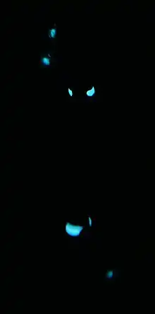 Its most distinguishing features are the cream-colored light organs underneath its eyes, which produce blue-green light likely used by the fish to attract prey, communicate with other fish, and frighten and confuse predators. These organs contain bioluminescent bacteria, fed by oxygen and nutrients from the fish's bloodstream,[6] which emit a constant light. The eyelight fish uses a black lid to cover the organs when it does not want to emit light.[5]