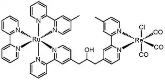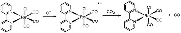 After excitation, CO2 coordinates or otherwise interacts with the inner coordination sphere of the reduced metal. Common products include formic acid, carbon monoxide, and methanol. Note that light absorption and catalytic reduction may occur at the same metal center or on different metal centers. That is, a photosensitizer and catalyst may be tethered through an organic linkage that provides for electronic communication between the species. In this case, the two metal centers form a bimetallic supramolecular complex. And, the excited electron that had resided on the functional ligands of photosensitizer passes through the ancillary ligands to the catalytic center, which becomes a one-electron reduced (OER) species. The advantage of dividing the two processes among different centers is in the ability to tune each center for a particular task, whether through selecting different metals or ligands.