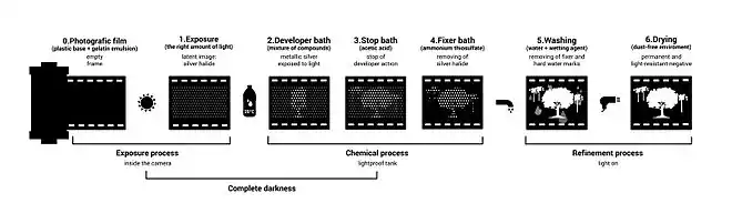 Photographic processing or photographic development is the chemical means by which photographic film or paper is treated after photographic exposure to produce a negative or positive image. Photographic processing transforms the latent image into a visible image, makes this permanent and renders it insensitive to light.[1]
