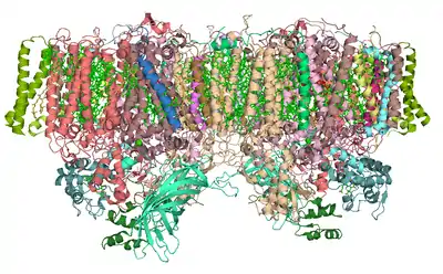 ions per monomer.[4] There are several crystal structures of photosystem II.[5] The PDB accession codes for this protein are 3WU2, 3BZ1, 3BZ2 (3BZ1 and 3BZ2 are monomeric structures of the Photosystem II dimer),[4] 2AXT, 1S5L, 1W5C, 1ILX, 1FE1, 1IZL.