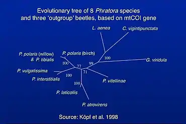 Mitochondrial sequences at the mitochondrial cytochrome c oxidase subunit I (DNA barcoding) gene show more divergence among willow- vs birch-feeding populations of P. polaris within Finland than between willow-feeding populations of P. polaris from Finland and P. tibialis from Switzerland.[11] In 1996, Köpf et al.[10] examined host plant preferences and mating behaviors for P. tibialis populations from Switzerland and a P. polaris population in eastern Finland. Beetles from all three populations showed similar host plant preferences, regardless of the host plant that they had been collected on, and P. tibialis and P. polaris individuals also mated with each other freely. These behavioral studies suggest that the actual biological species boundaries may be different than current classifications suggest. For example, birch-feeding populations of P. polaris might be classified as different species.[11]