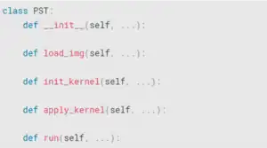 The code in PhyCV has a modular design which faithfully follows the physical process from which the algorithm was originated. Both PST and PAGE modules in the PhyCV library emulate the propagation of the input signal (original digital image) through a device with engineered diffractive property followed by coherent (phase) detection. The dispersive propagation applies a phase kernel to the frequency domain of the original image. This process has three steps in general, loading the image, initializing the kernel and applying the kernel. In the implementation of PhyCV, each algorithm is represented as a class in Python and each class has methods that simulate the steps described above. The modular code architecture follows the physics behind the algorithm. Please refer to the source code on GitHub for more details.