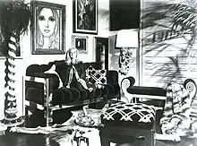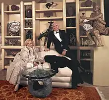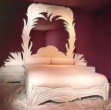 Such was Morris' reputation for producing lavish and expensive beds that People magazine ran a feature story on her in 1978, noting such clients as Gladys Knight, Allan Carr, Cher and even Who drummer Keith Moon (for whom Morris outfitted a Malibu, California beach house). "I knew I had to make something that no one else could build cheaper," said Morris about her beds. "In Vegas, I've done beds in gold with gold inlays."[9] Among the interiors and furnishings Morris created for film producer Allan Carr (Grease; Grease 2) was a glittering Egyptian-themed subterranean disco in his Beverly Hills house where actors John Travolta and Olivia Newton-John danced the night away for the paparazzi. Newton-John later appear in a risqué photo taken in the Phyllis Morris's showroom by renowned photographer Helmut Newton, who posed the singer topless for her 1985 Soul Kiss album artwork.