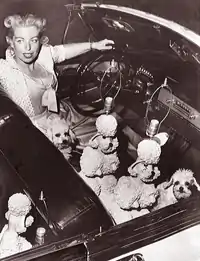 The poodle lamp propelled Morris into the limelight and it wasn't long before she became a local celebrity. Often wearing a full-length mink coat and pink pedal pusher slacks, she would drive throughout Los Angeles in a pink Cadillac convertible with its top down and the front and back seats filled with pink poodle lamps and real pink-dyed poodles in the front seat. Not only did the residents of L.A. take note of Morris and her colorful marketing technique, but famed newspaper columnist Walter Winchell eventually wrote "Who's the wise guy that said 'beauty and business don't mix?' Meet striking blonde Phyllis Morris. She's been setting this nation's furniture styling for ten years."[1]