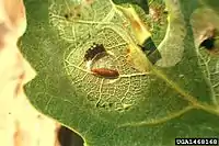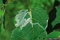 The larvae feed on Populus tremuloides and balsam poplar. The larvae feed on the contents of epidermal cells on both top and bottom surfaces of quaking aspen leaves, leaving the photosynthetic tissue of the mesophyll intact. This type of feeding is taxonomically restricted to a small subset of leaf mining insects but can cause widespread plant damage during outbreaks.