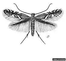 The wingspan is 6–8 mm. The posterior tarsi with dark fuscous spots. Forewings are golden-brown to dark brown ; a white median streak from base to near middle, dark margined above ; dorsum narrowly white towards base ; four costal and three dorsal white wedge-shaped spots, anteriorly blackish-margined, first costal small, first dorsal long, sometimes interrupted ; a blackish apical spot. Hindwings are dark grey. The larva is pale yellowish ; dorsal line green ; head pale brown.[1]