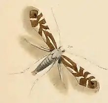 The wingspan is 7–9 mm. The forewings are fuscous or ochreous, in the female more whitish towards base; a pointed white median streak from base to middle, edged with dark fuscous above; four costal and three dorsal posterior shining white wedge-shaped spots, edged anteriorly and first costal posteriorly with dark fuscous, first dorsal broad, before first costal; a round black apical dot; an ill-defined dark hook in apical cilia. Hindwings are grey. The larva is greenish-white; dorsal line green; head pale brown [2]