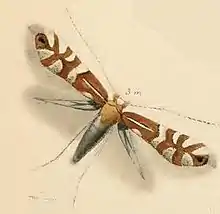 The wingspan is 7–9 mm. The head is golden-brownish, face white. Antennae with apex white. Forewings golden brownish; a shining white median streak from base to 2/5, dark margined above; an ill defined white dorsal spot at 1/3; a somewhat angulated median fascia, three posterior costal and two dorsal triangular spots shining white, anteriorly dark margined; a black apical dot. Hindwings are rather dark grey. The larva is yellow-green; dorsal line greenish-grey; head pale brown.[2]