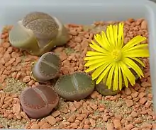 A Lithops species, showing its decussate growth in which a single pair of leaves is replaced at a time, leaving just one live active pair of leaves as the old pair withers