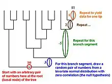 Martins and Garland[18] proposed in 1991 that one way to account for phylogenetic relations when conducting statistical analyses was to use computer simulations to create many data sets that are consistent with the null hypothesis under test (e.g., no correlation between two traits, no difference between two ecologically defined groups of species) but that mimic evolution along the relevant phylogenetic tree. If such data sets (typically 1,000 or more) are analyzed with the same statistical procedure that is used to analyze a real data set, then results for the simulated data sets can be used to create phylogenetically correct (or "PC"[7]) null distributions of the test statistic (e.g., a correlation coefficient, t, F). Such simulation approaches can also be combined with such methods as phylogenetically independent contrasts or PGLS (see above).