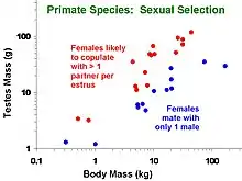 Testes mass of various species of Primates in relation to their body size and mating system. Larger-bodied species tend to have larger testes, but at any given body size species in which females tend to mate with multiple males have males with larger testes.