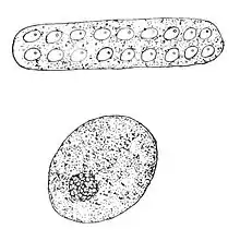 Drawing of the eggs of Physella gyrina: upper image is the egg-mass showing position of eggs in envelope. Lower images is a single egg showing the position of an embryo.