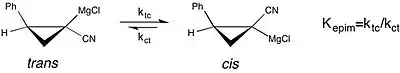 A modern example of the study of solvent effects on chemical equilibrium can be seen in a study of the epimerization of chiral cyclopropylnitrile Grignard reagents.[18] This study reports that the equilibrium constant for the cis to trans isomerization of the Grignard reagent is much greater—the preference for the cis form is enhanced—in THF as a reaction solvent, over diethyl ether. However, the faster rate of cis-trans isomerization in THF results in a loss of stereochemical purity. This is a case where understanding the effect of solvent on the stability of the molecular configuration of a reagent is important with regard to the selectivity observed in an asymmetric synthesis.