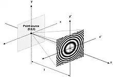 Consider a point source located at the origin which illuminates a photographic plate which is located at a distance normal to the z axis. The phase difference between the source and a point (x, y, z) is given approximately by[1]: 3.1