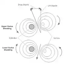The second equation suggests that the Strouhal number is a weak negative function of Reynolds number. This suggests that the dynamic similarity approximation is reasonable. The fluctuating force exerted on the cylinder is a result of the flow circulation around it caused by the alternate vortex separation as suggested in the third figure. The fact that the vortices are not directly behind the cylinder suggests that the force vector has both a lift and drag component, resulting in lift and drag dipoles.