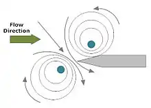 Hydrodynamic feedback (class I) influences the formation of new vortices and exerts a fluctuating force on the cylinder. The flow field is shown in the upper figure on the right (created by Gary Koopman). Theodor von Karman[22] identified and analyzed the flow behind objects like a cylinder, and since then this special flow has been called the Karman vortex street. Vincenc Strouhal was the first to scientifically investigate the sound emitted by flow around a rigid cylinder. At low Reynolds numbers the tone was pure, and the frequency was proportional to the steady flow speed U and inversely proportional to the cylinder diameter d.