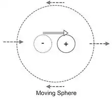 Whistles that generate sound through fluctuations of momentum or stress and strain of a force exerted on the surrounding medium are called dipole-like sources. The figure on the right is an example of a small rigid sphere that is moving back and forth in a given direction. This results in a non-uniform sound field. The sound power can be expressed as: