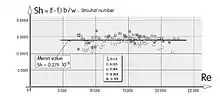 To invoke dynamic similarity,[4] the characteristic speed in a study was chosen to be the average speed U of the jet at the orifice and the characteristic length was chosen to be the orifice diameter δ. Tests were made at five spacing distances h/δ from the orifice. Two scaling laws were used: the Strouhal number was graphed as a function of the Reynolds number. The results are shown in the figure on the right.