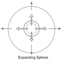 Whistles that generate sound through fluctuations of mass flow across a boundary are called monopole-like sources. The figure on the right is an example of a small sphere whose volume is oscillating. For this type of source, the sound is emitted radially, so the sound field is the same in every direction and decays with the inverse square of the distance. The sound power can be expressed as: