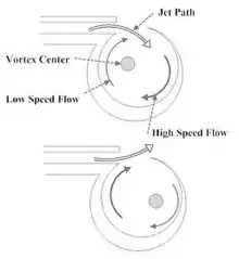 An annular duct carries the fluid that creates the annular jet. The jet impinges on a sharp ended ring with two toroidal cavities on either side. In Levavasseur's patent,[41] a structure is added downstream of the annular opening to act as a coupling horn to direct the sound. The sound generated is very intense. It appears that no scientific study has been done to elucidate the detailed feedback mechanisms of its operation, although it is clear that this whistle has class I feedback mechanism, similar to the police whistle.