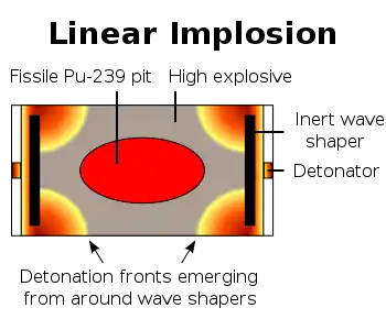 In the two-point linear implosion, the nuclear fuel is cast into a solid shape and placed within the center of a cylinder of high explosive. Detonators are placed at either end of the explosive cylinder, and a plate-like insert, or shaper, is placed in the explosive just inside the detonators. When the detonators are fired, the initial detonation is trapped between the shaper and the end of the cylinder, causing it to travel out to the edges of the shaper where it is diffracted around the edges into the main mass of explosive. This causes the detonation to form into a ring that proceeds inwards from the shaper.[21]