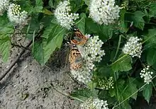 This plant is a deciduous shrub usually growing up to 2.1 meters tall,[2] sometimes reaching 3 meters.[3] It can form dense thickets. The branches are hairless, and older ones have shreddy bark. The leaves have three to five lobes and serrated edges. Dark green when mature, they turn brownish red by early fall. The inflorescence is a corymb of flowers that have white petals measuring about 4 millimeters in length. The fruit is a follicle roughly one centimeter long.[2][3][4]