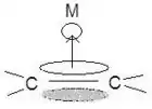 The specifics for binding of π cyclic systems are much more complex and depend on the electrons, the HOMO, and the LUMO in each individual case of molecules. Cyclic π systems can bind monohapto or polyhapto depending on the individual situation. This means that π bonds can bind individually to the metal or there can be a single bond from the center of a benzene or cyclopentadienyl complex. Of course the bonding modes (η1, η3, η5, etc.) determine the number of donated electrons (1, 3, 5, etc.). The diversity of these cyclic complexes allows for a seemingly endless number of metallic structures.[9]