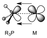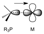 Phosphines accept electron density from metal p or d orbitals into combinations of P–C σ* antibonding orbitals that have π symmetry.[6] When phosphines bond to electron-rich metal atoms, backbonding would be expected to lengthen P–C bonds as P–C σ* orbitals become populated by electrons. The expected lengthening of the P–C distance is often hidden by an opposing effect: as the phosphorus lone pair is donated to the metal, P(lone pair)–R(bonding pair) repulsions decrease, which acts to shorten the P–C bond. The two effects have been deconvoluted by comparing the structures of pairs of metal-phosphine complexes that differ only by one electron.[7] Oxidation of R3P–M complexes results in longer M–P bonds and shorter P–C bonds, consistent with π-backbonding.[8] In early work, phosphine ligands were thought to utilize 3d orbitals to form M–P pi-bonding, but it is now accepted that d-orbitals on phosphorus are not involved in bonding as they are too high in energy.[9][10]