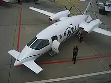 The Piaggio P.180 Avanti is an Italian executive transport aircraft with twin turboprop engines mounted in pusher configuration.[2] It seats up to nine people in a pressurized cabin and may be flown by one or two pilots. The design is of three-surface configuration, having both a small forward wing and a conventional tailplane, as well as its main wing, with the main wing spars passing behind the passenger cabin area.