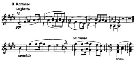 The Romanze, although not strictly in sonata form, has its second theme of the exposition ascribe to the classical model of modulating to the dominant (I-V), and, when it returns, it modulates to the mediant (III). Chopin wrote in the same letter to Tytus, saying, "It is not meant to create a powerful effect; it is rather a Romance, calm and melancholy, giving the impression of someone looking gently towards a spot that calls to mind a thousand happy memories. It is a kind of reverie in the moonlight on a beautiful spring evening."[9] The second movement has been described as "unashamedly heart-on-your-sleeve stuff."[10]