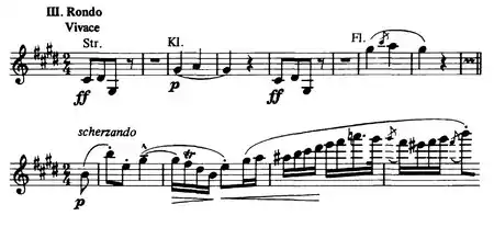 Written with much procrastination, hesitation, and difficulty, the third movement features Krakowiak rhythms, a syncopated, duple-time popular dance in contemporary Krakow.[11] It became one of the last pieces written by Chopin before the political turmoil in Poland that prevented him from returning. When, after completing the Rondo in August 1830, he played it privately — first with a string quartet and then a small orchestral ensemble.==
