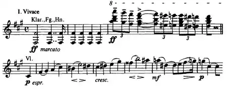 - This contrast with the later works can be heard from the opening bars, where a brass fanfare precedes a flourish of double octaves and chords on the piano – a musical gesture similar to the Schumann and Grieg piano concertos. This flourish occurs later in the movement, as well, an important factor in the symmetry of the movement. The main theme (like the other themes in this work common to both versions) is short by Rachmaninoff's standards but already shows the sequential devices and arch-like design inherent in his later works.[2]