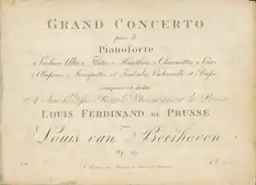 The Piano Concerto No. 3 in C minor, Op. 37 is generally thought to have been composed in 1800, although the year of its composition has been questioned by some contemporary musicologists. It was first performed on 5 April 1803, with the composer as soloist.[1] During that same performance, the Second Symphony and the oratorio Christ on the Mount of Olives were also premiered.[2] The composition was published in 1804, and was dedicated to Prince Louis Ferdinand of Prussia. The first primary theme is reminiscent of that of Mozart's 24th Piano Concerto.