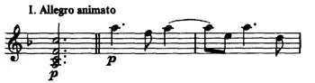 - The Allegro animato alternates several times between two contrasting themes. It begins warmly, introducing a simple subject on the piano, which is imbued at each new variation with increasing energy by a brilliant and technically challenging piano part featuring runs up and down the keyboard. This dissolves into a much slower, more melancholic subject, recalling that of the Andante sostenuto movement of Saint-Saëns' second piano concerto. Like waves, the two lead into one another until finally the second theme gives way to a gentle coda.