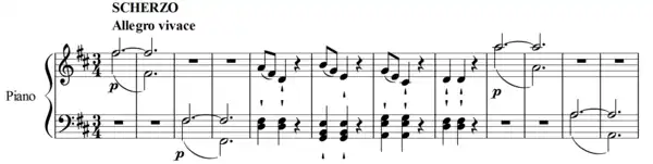 The Scherzo is in D major. Its most important feature is the contrast between four long notes, each an octave apart, and a fast quaver melody. The trio, in B minor, repeats a simple four-bar melody eight times over, with a relentless broken octave–chord bass figuration adding harmonic, rhythmic, and dynamic intensity as the repeats progress. It provides a diversion to the blithe scherzo, contrasting sharply in tone and adding gravity to the prevailing humor.