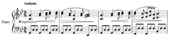 8 time, quite uncommon in Beethoven's works, and a gentle, light atmosphere to present contrast to the ecstatic first movement. It is about two and a half minutes long.