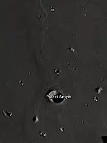 Piazzi Smyth is a small lunar impact crater in the eastern part of the Mare Imbrium. It was named after Scottish astronomer Charles Piazzi Smyth.[1] This is an isolated feature located about 100 kilometers to the southwest of the Montes Alpes mountain range. To the southeast of this crater is Mons Piton, an isolated mountain that rises to a height of 2.3 km and occupies a diameter of about 25 km.