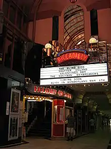 In 1984 the theatre and arcade underwent a significant refurbishment, with the refurbishment winning an architectural award from the Royal Australian Institute of Architecture (WA Chapter) in 1986.[1] The theatre and arcade are classified by the National Trust of Australia and are included on the State Heritage Register. The Piccadilly Cinema was the last operating cinema in the Perth central business district before its closure in 2013 and until the opening of Raine Square's Palace Cinema in 2018.[2][3][4] Following a three-year refurbishment and renovation, the arcade was reopened in November 2021.[5]