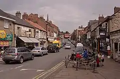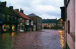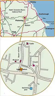 Pickering is situated at the junction of the A170, which links Scarborough with Thirsk, and the A169 linking Malton and Whitby. It occupies a broad strip of land between the Ings and Low Carrs to the south of the main road and a ridge of higher, sloping ground which is surmounted by the castle to the north. It is sited where the older limestone and sandstone rocks of the North York Moors meet the glacial deposits of the Vale of Pickering. The limestone rocks form the hill on which the higher parts of the town and the castle are situated. Pickering Beck is a watercourse that runs north to south through the centre of the town. It rises on the moors and drains southwards through Newton Dale before reaching Pickering. It is prone to flooding at times of exceptional rainfall when areas of town close to the beck become flooded. The town centre lies east of the beck, though the population is almost equally divided between its east and west wards. Pickering has developed around the old Market Place but the majority of houses are now in the residential estates off the main A170 road.[10]