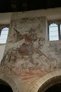 Pickering Church has a Saxon foundation, but the earliest phases of the present building date to the 12th and 13th centuries, with substantial additions in the 14th and 15th. In 1852[26] restoration work revealed a series of wall paintings on the north and south walls of the nave. Despite a local and national outcry, the paintings were whitewashed, and only rediscovered and restored in 1876–78. They have been called "the most complete collection of medieval wall paintings in England".[27]