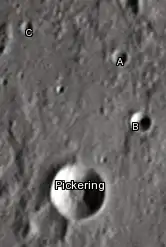 Pickering is a small lunar impact crater located to the northeast of the worn walled plain Hipparchus in the central region of the Moon. It was named after American astronomers Edward Charles Pickering and William Henry Pickering.[1] It lies more than 25 km northeast of the crater Horrocks, which lies within Hipparchus. To the southeast is the lava-flooded Saunder.