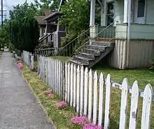 A picket fence, ideally white, has iconic status as Americana,[3] symbolizing the ideal middle-class suburban life, with a family and children, large house, and peaceful living. This stems from the fact that houses in quiet, middle-class neighborhoods often have yards enclosed by picket fences.[4] In recent years, some people have associated picket fences with what they regard as the more negative aspects of this lifestyle. For example, the director David Lynch uses ironic images of the picket fence in his 1986 film Blue Velvet.[5]