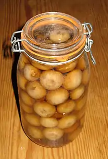 Pickled onions are a food item consisting of onions (cultivars of Allium cepa[1]) pickled in a solution of vinegar and salt, often with other preservatives and flavourings.[2] There is a variety of small white pickled onions known as 'silverskin' onions;[3][4] due to imperfections they are pickled instead of being wasted.[5] They are frequently used as an essential component of the Martini cocktail variant known as a Gibson.[6]