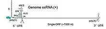 The genome is not segmented and positive-sense (the same sense as mammalian mRNA, being read 5' to 3'). Unlike mammalian mRNA, picornaviruses do not have a 5' cap, but a virally encoded protein known as VPg. However, like mammalian mRNA, the genome does have a poly(A) tail at the 3' end. An untranslated region (UTR) is found at both ends of the picornavirus genome. The 5' UTR is usually longer, being around 500–1200 nucleotides (nt) in length, compared to that of the 3' UTR, which is around 30–650 nt. The 5' UTR is thought to be important in translation, and the 3' in negative-strand synthesis; however, the 5' end may also have a role to play in virulence of the virus. The rest of the genome encodes structural proteins at the 5' end and nonstructural proteins at the 3' end in a single polyprotein.