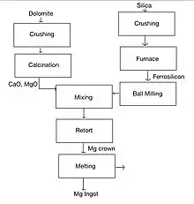 The Pidgeon process is a practical method for smelting magnesium. The most common method involves the raw material, dolomite being fed into an externally heated reduction tank and then thermally reduced to metallic magnesium using 75% ferrosilicon as a reducing agent in a vacuum.[1] Overall the processes in magnesium smelting via the Pidgeon process involve dolomite calcination, grinding and pelleting, and vacuum thermal reduction.[1] Besides the Pidgeon process, electrolysis of magnesium chloride for commercial production of magnesium is also used, at one point in time accounting for 75% of the world's magnesium production.[2]